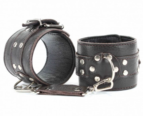 Оковы выполнены из натуральной мягкой кожи темно-коричневого цвета. Изделие декорировано металлическими заклепками. По середине расположено полукольцо из сварной фурнитуры. Оковы надежно фиксируются пряжками и ремнями, позволяющими выбрать нужный размер, подойдут на обхват от 16 до 27 см. Кожаное соединение на карабинах фиксирует оковы вместе. Приятные для тела и стильные наножники отлично подходят для воплощения эротических БДСМ фантазий. Ширина - 6 см.