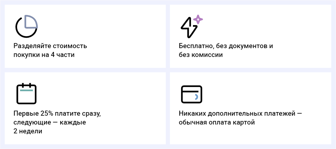 Сервис «Долями» помогает вам разделить сумму покупки на четыре равных платежа — без комиссии и дополнительных плат. Покупку получите сразу после оплаты первой части.